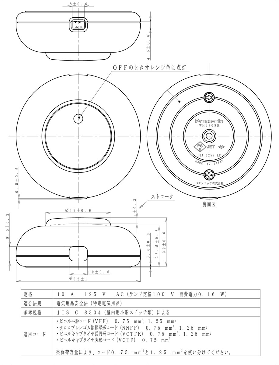 メーカー: Panasonic (旧National 旧ナショナル) /パナソニック電工(旧松下電工) シリーズ名:フットスイッチ 10A 10A 125V AC プッシュON/OFFスイッチ(OFF時ランプ点灯) ≪適用コード≫ JIS C3306 ビニル平形コード(VFF)0.75mm2、1.25mm2 JIS C 3301 クロロプレンゴム絶縁平形コード(NNFF)0.75mm2、1.25mm2 JIS C 3306 ビニルキャブタイヤ長円形コード(VCTFK)0.75mm2、1.25mm2 JIS C 3306 ビニルキャブタイヤ丸形コード(VCTF)0.75mm2 ※負荷容量により、コード0.75mm2と1.25mm2を使い分けしてください。